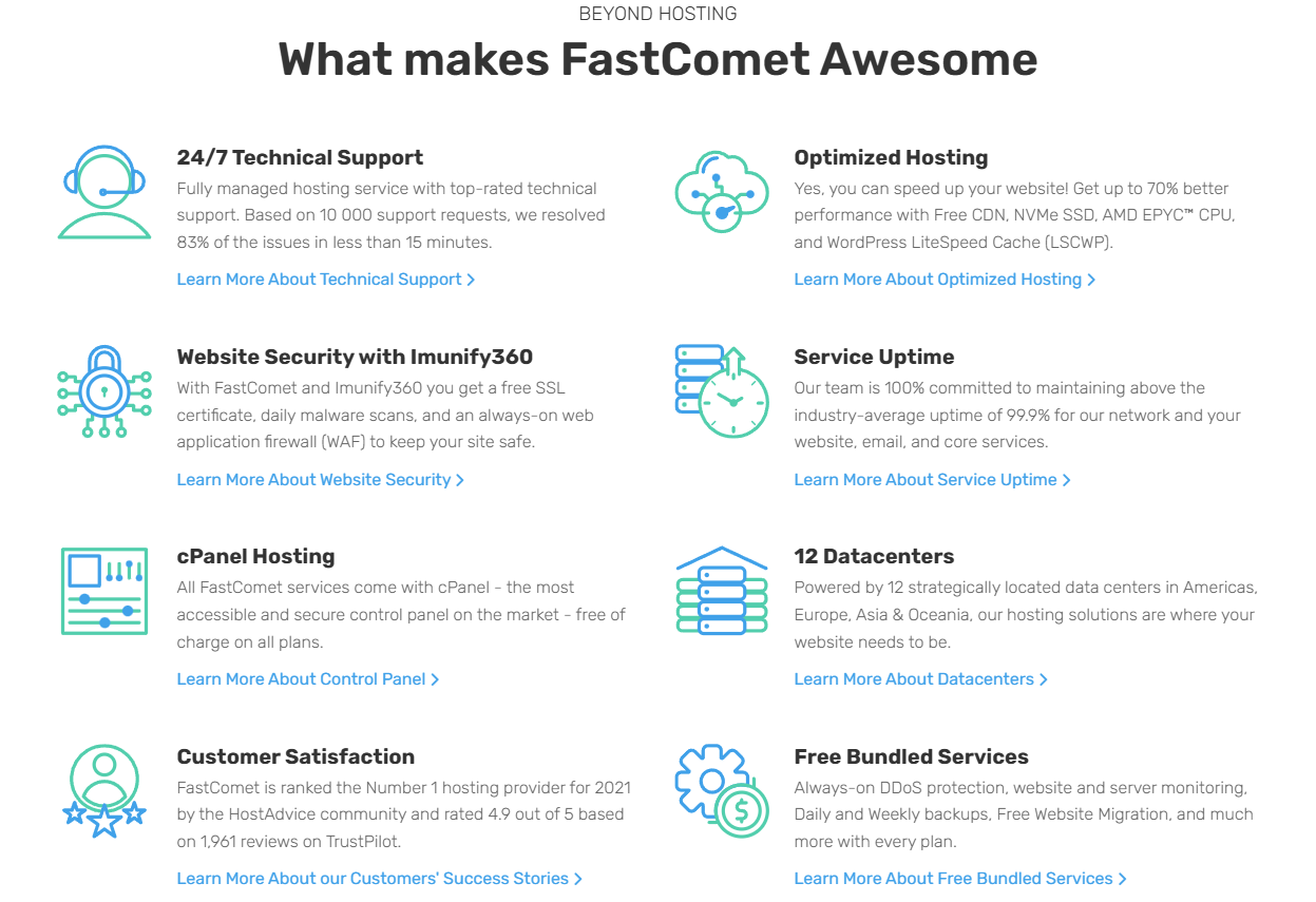 Established in 2013FastComet is a relatively new web hosting company that has grown immensely over the past years. They’re currently running 12 data centers around the globe and have a team of 100+ employees. The company provides fast and secure hosting to small and mid-sized businesses. Owning the latest server hardware and the use of industry-leading software, FastComet justifies its name with notably fast performance.