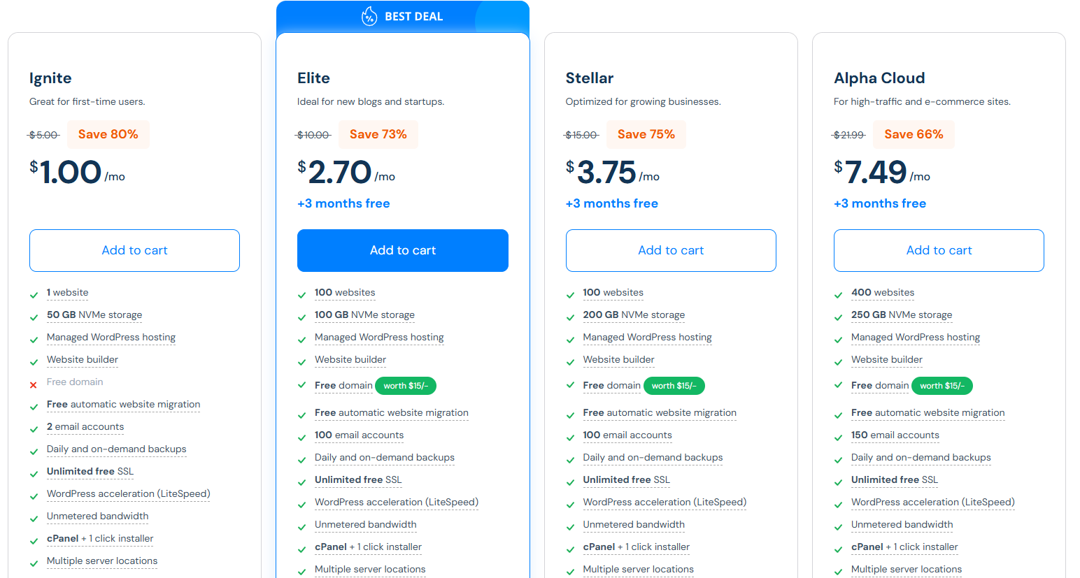 Milesweb.com has four shared hosting plans that come with a number of space, traffic and additional hosting features. Storage ranges from 5GB-40GB. Bandwidth ranges from 50GB-400GB. All plans come with Free dedicated SSL and free website builder as well as a number of email accounts and unlimited FTP accounts. Another great feature of their hosting plans is their 1 click installs. You can download applications such as WordPress and Joomla. All plans except their startup plan come with a Free Domain name.